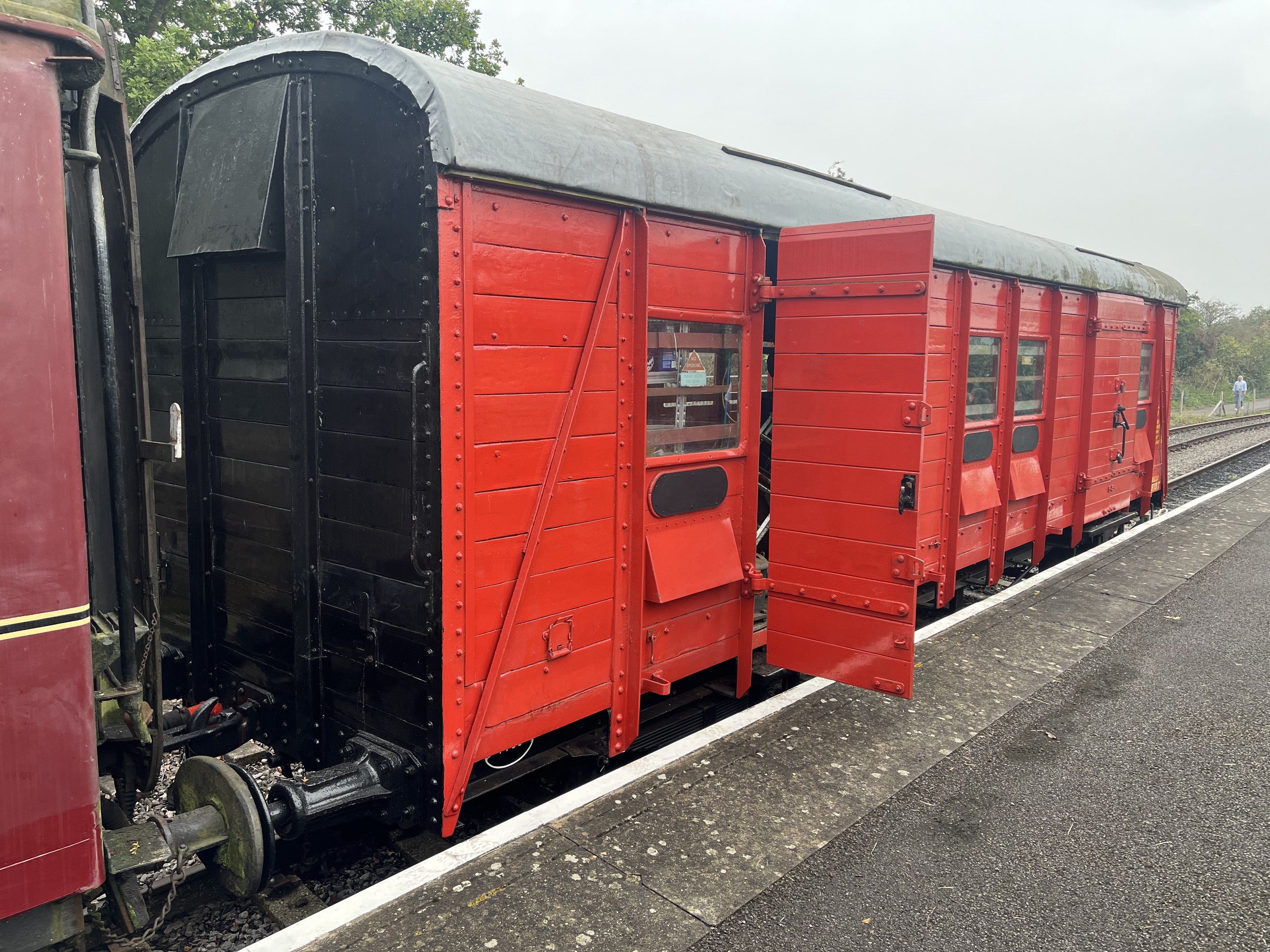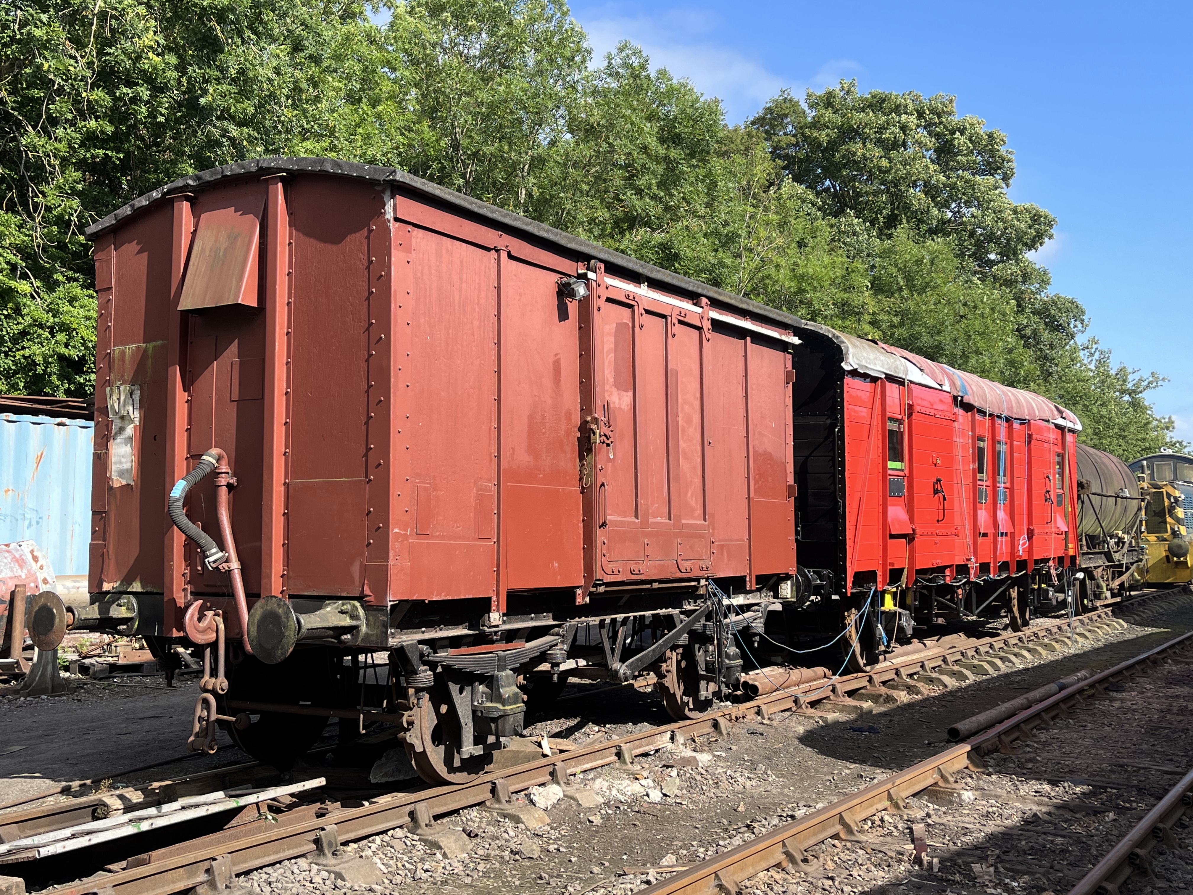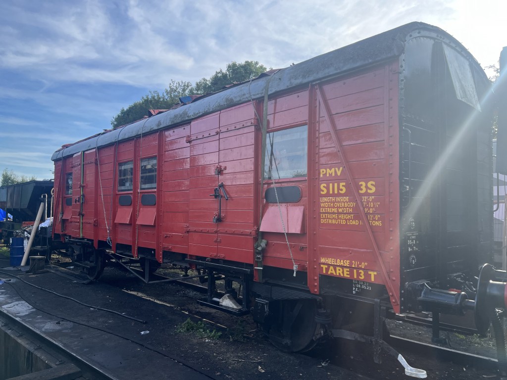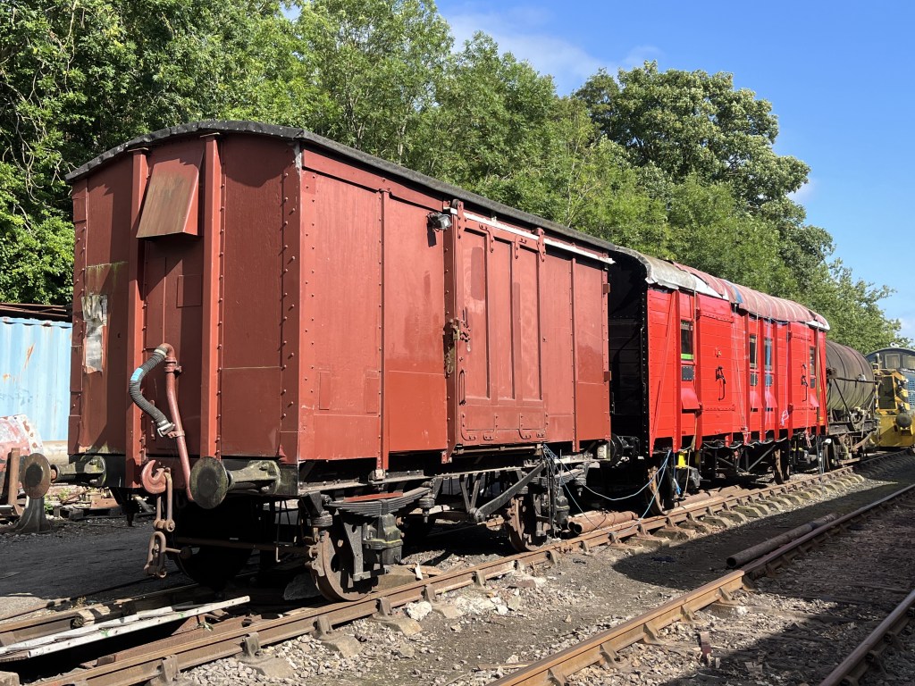 The van is in reasonable condition, however like any wooden-bodied vehicle which is stored outdoors 100% of the time, deterioration is inevitable. It has seen a rolling program of remedial work in recent years, including attention to the East-side woodwork. A new sliding door is being constructed off-site to eventually replace this one which is on its last legs.The van is seen stabled next to our PMV in Bitton yard No.4 road during a re-shuffle of items in AJune 2023. Whilst it is capable of being moved short distances, it is not currently in fully operational status, with among other things a missing vacuum cylinder preventing it being formed in trains.