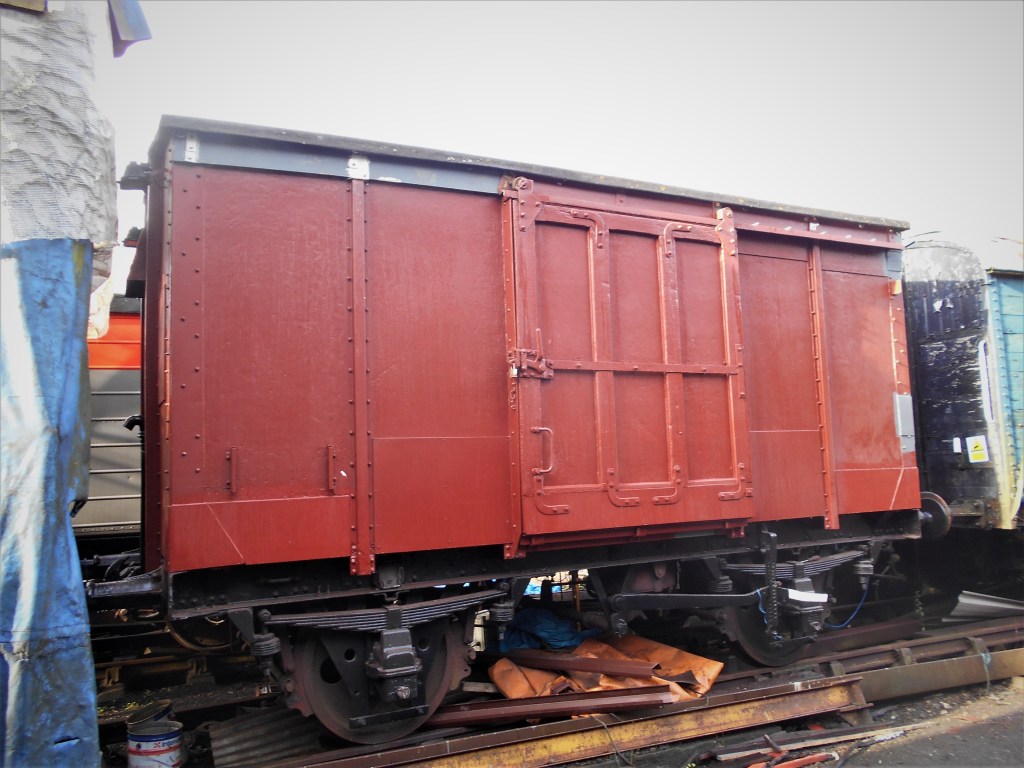 In 2007 it was acquired by the London Midland Society and moved to Bitton, where it is used as a stores vehicle for 4123. The van is operational and makes occasional appearances in the AVR’s demonstration goods train, as seen above. It is undergoing a rolling programme of maintenance and restoration, and has recently been fitted with replacement number plates, data panels and new doors. It has also had its step boards replaced after many years without them.