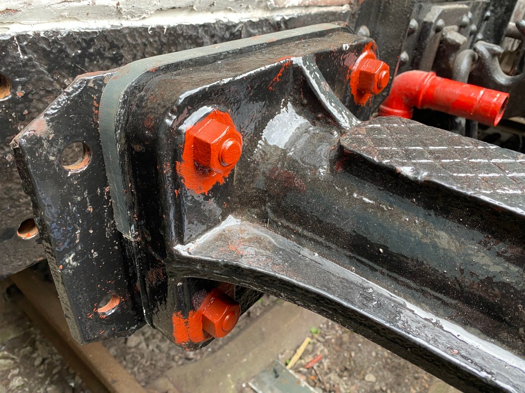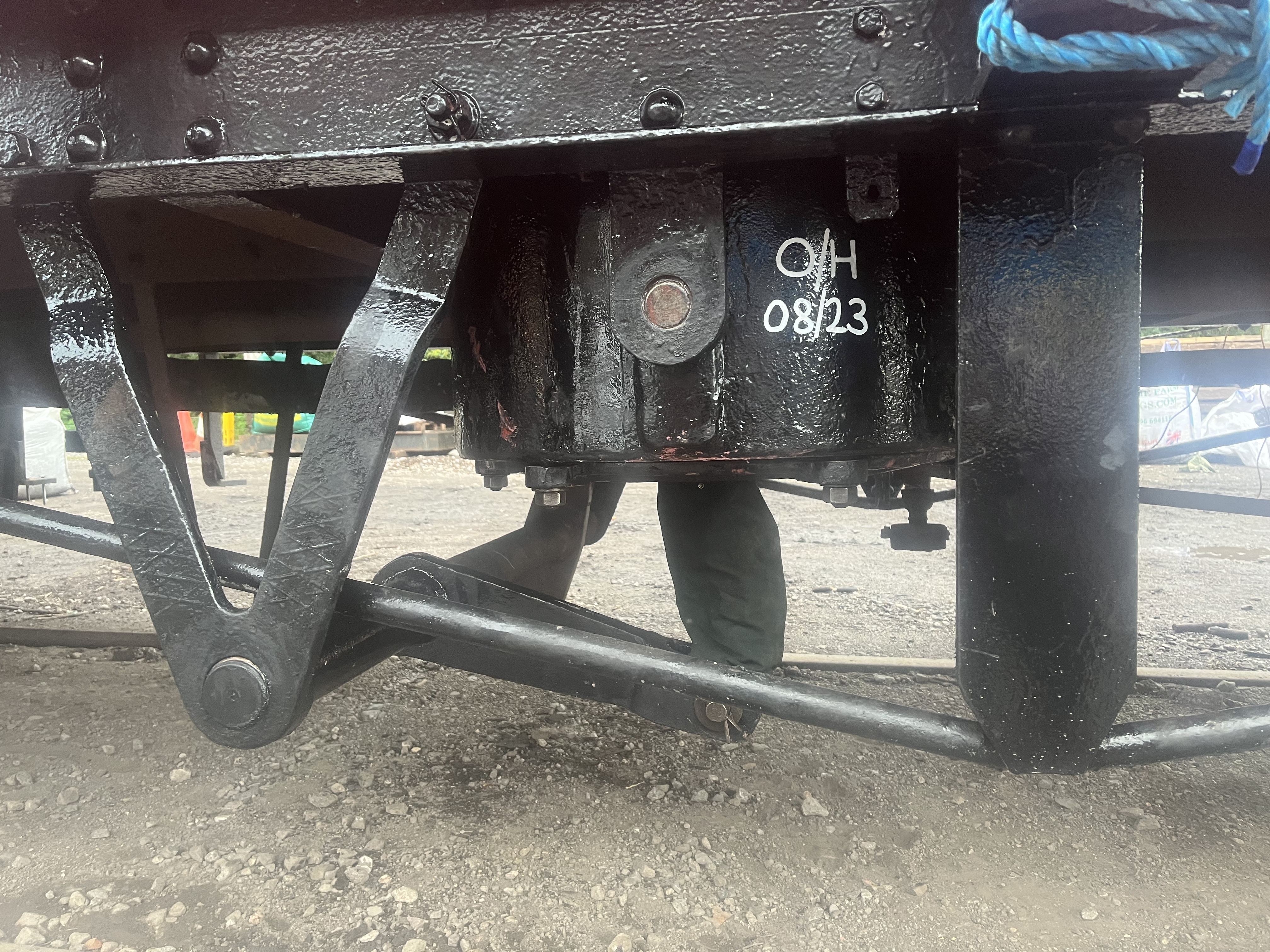 PMV at the start of its re-paint and re-plank works. Dave Isaacs who has done the vast majority of the work on this is seen posing on his ladder. New planking – made from far Eastern Meranti – a lightweight hardwood which machines well. The Southern Railway used a modified form of tongue and groove joint detailing for its wooden-bodied vehicles, and this has been reproduced here to ensure the new planks are a match and good fit with the old ones.View on the West side of the van showing some of the new planking.Interior view of one corner showing new planking in day-glo green, and an area of repaired floor.The van in Bitton shed yard, shortly before going over the inspection pit to have its brakes adjusted.As well as attention to the planking, the running gear of the van was attended to in order to make the van fit for use. Here is the overhauled vacuum cylinder re-fitted to the chassis.The springs were also sent away for overhaul to deal with corossion between the leaves.The eyebolts and diaphram plates which hold the springs on to the chassis were also overhauled to deal with wear in the holes and threads, and corossion.New wooden packing pieces were installed behind the buffer bodies, and the buffer backing plates were removed to deal with jack-rusting between them and the buffer beam.With the van repainted and the running gear overhauled and inspected we were able to run it in the AVR’s passenger train during the September 2023 gala. We think this is likely to have been the first time the van was formed into a passenger service in at least 50 years!PMV S1153S is seen at the end of a passenger service which had just arrived at Avon Riverside station from Bitton.The van at Avon Riverside Station – Recreating the days when the inclusion of a van for carrying parcels and other items was commonplace.A somewhat optimistic destination has been chalked on the side of the Van – it’s not possible to get from Avon Riverside to Bristol Temple Meads other than by road…!